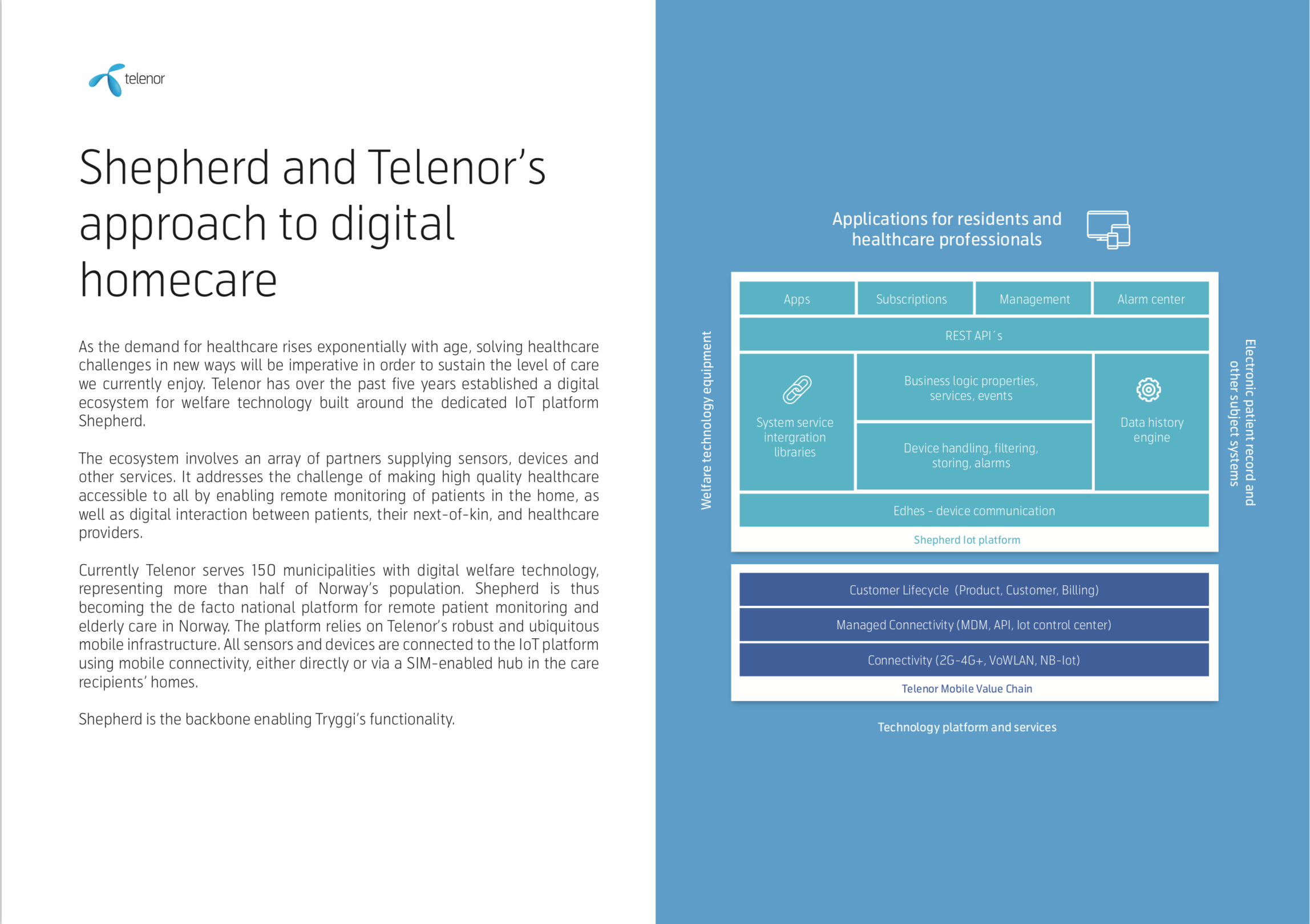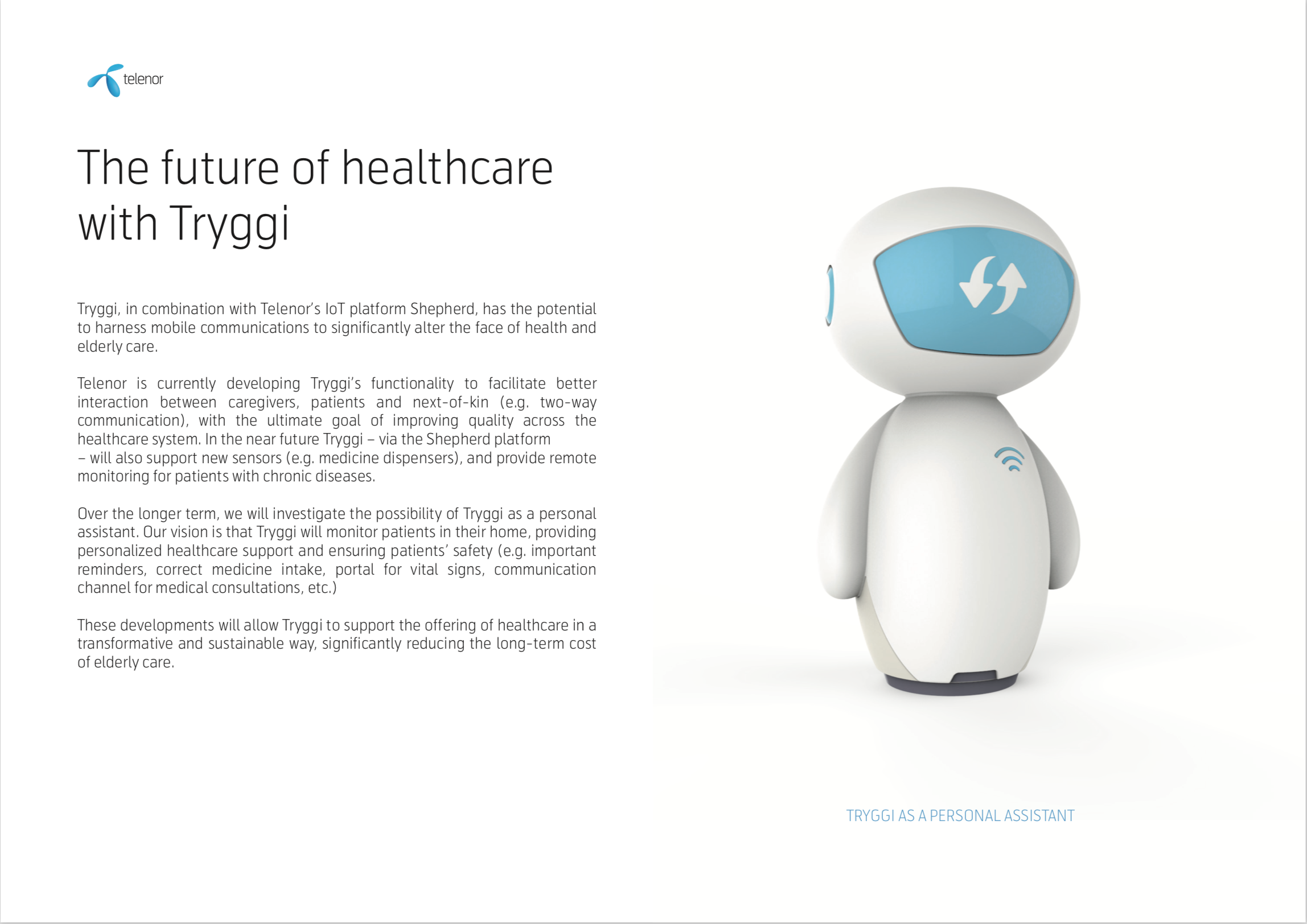 There is a global trend where an aging population will pose challenges for the upcoming generation. By 2030, there will be twice as many 80-year-olds in Norway. To maintain welfare at the same level as today, we must offer health services in new ways.” - Telenor.